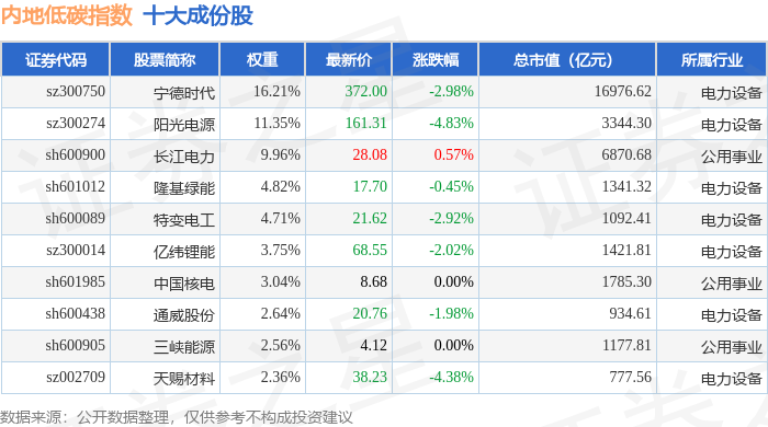 证券之星消息,12月18日,内地低碳(000977)指数报收于2025.19点,跌1.66%,成交516.38亿元,换手率0.62%。当日该指数成份股中,上涨的有9家,川投能源以1.33%的涨幅领涨,下跌的有37家,阳光电源以4.83%的跌幅领跌。