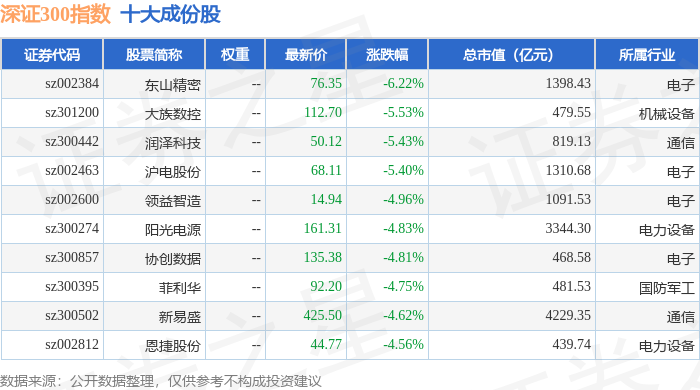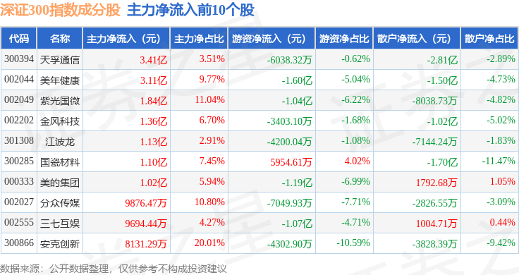 资金流向方面,深证300(399007)指数成份股当日主力资金净流出合计154.94亿元,游资资金净流入合计33.91亿元,散户资金净流入合计121.03亿元。成份股资金流向详情见下表: