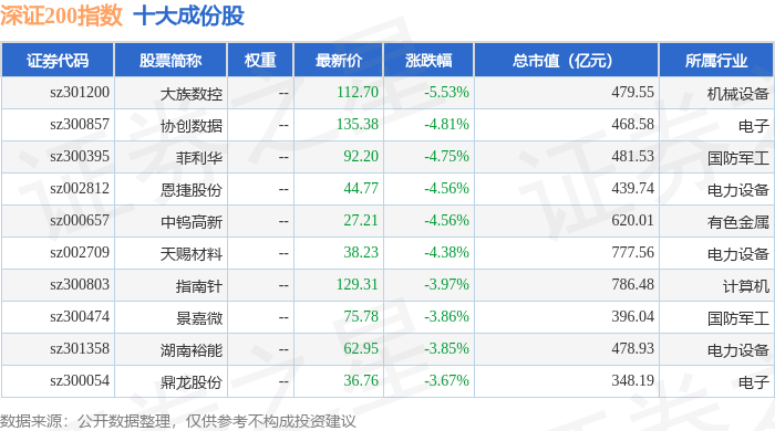 证券之星消息,12月18日,深证200(399009)指数报收于4999.79点,跌0.8%,成交1258.04亿元,换手率1.49%。当日该指数成份股中,上涨的有64家,美年健康以10.05%的涨幅领涨,下跌的有132家,大族数控以5.53%的跌幅领跌。