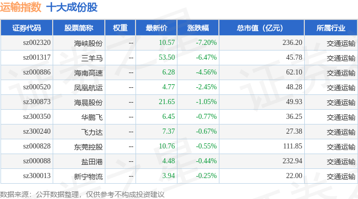 资金流向方面,运输指数(399237)成份股当日主力资金净流出合计4.81亿元,游资资金净流入合计1.21亿元,散户资金净流入合计3.59亿元。成份股资金流向详情见下表: