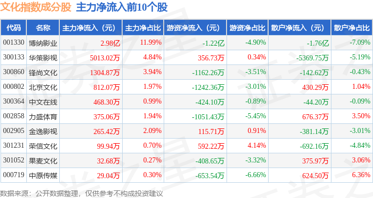资金流向方面,文化指数(399248)成份股当日主力资金净流入合计2.63亿元,游资资金净流出合计2.27亿元,散户资金净流出合计3583.9万元。成份股资金流向详情见下表: