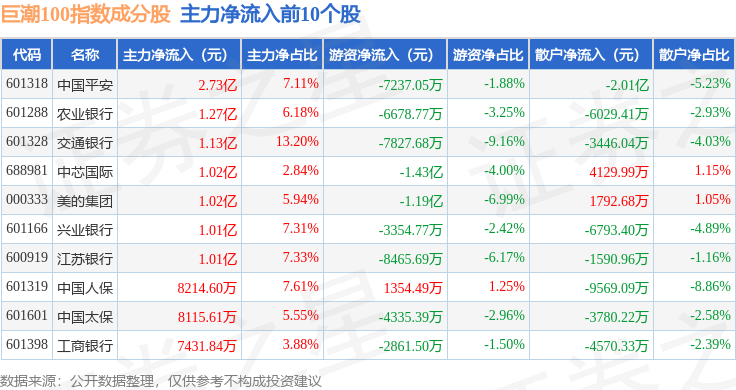 资金流向方面,巨潮100(399313)指数成份股当日主力资金净流出合计106.38亿元,游资资金净流入合计35.37亿元,散户资金净流入合计71.0亿元。成份股资金流向详情见下表: