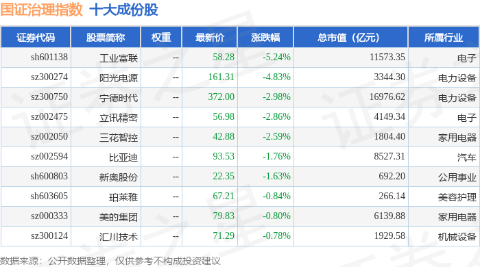 证券之星消息,12月18日,国证治理(399322)指数报收于10373.23点,跌0.43%,成交990.79亿元,换手率0.24%。当日该指数成份股中,上涨的有25家,陕西煤业以3.74%的涨幅领涨,下跌的有25家,工业富联以5.24%的跌幅领跌。