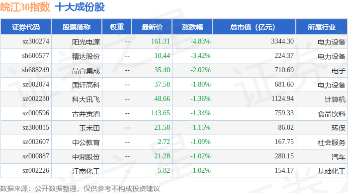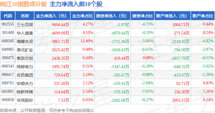 资金流向方面,皖江30(399350)指数成份股当日主力资金净流出合计12.54亿元,游资资金净流入合计1.19亿元,散户资金净流入合计11.36亿元。成份股资金流向详情见下表: