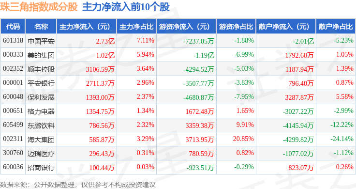 资金流向方面,珠三角(399356)指数成份股当日主力资金净流出合计63.53亿元,游资资金净流入合计18.86亿元,散户资金净流入合计44.67亿元。成份股资金流向详情见下表:
