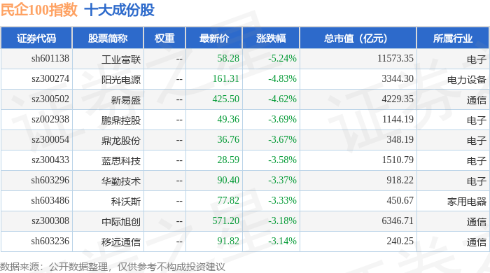 资金流向方面,民企100(399362)指数成份股当日主力资金净流出合计99.87亿元,游资资金净流入合计31.78亿元,散户资金净流入合计68.08亿元。成份股资金流向详情见下表: