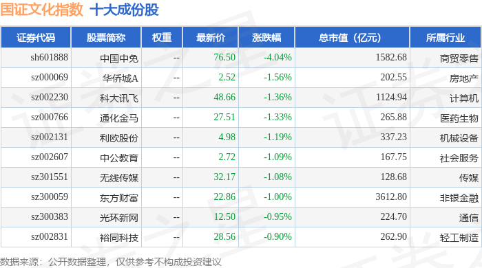 国证文化(399397)指数十大成份股详情如下: