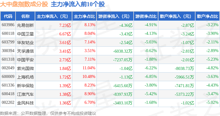 资金流向方面,大中盘(399400)指数成份股当日主力资金净流出合计237.37亿元,游资资金净流入合计52.28亿元,散户资金净流入合计184.67亿元。成份股资金流向详情见下表: