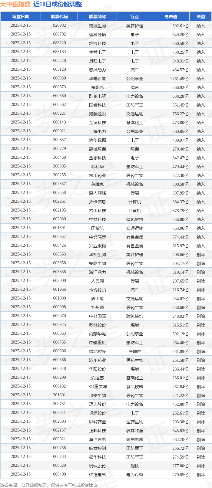 近10日内大中盘(399400)指数成份股做了调整,新纳入了26只股票,剔除了26只股票。