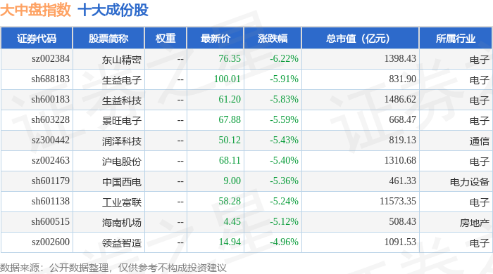 证券之星消息,12月18日,大中盘(399400)指数报收于4104.44点,跌0.6%,成交5324.41亿元,换手率0.6%。当日该指数成份股中,上涨的有179家,东兴证券以9.98%的涨幅领涨,下跌的有308家,东山精密以6.22%的跌幅领跌。