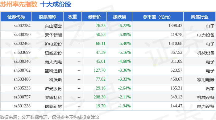 证券之星消息,12月18日,苏州率先(399410)指数报收于2793.38点,跌1.87%,成交375.48亿元,换手率2.16%。当日该指数成份股中,上涨的有8家,亨通光电以4.29%的涨幅领涨,下跌的有21家,东山精密以6.22%的跌幅领跌。
