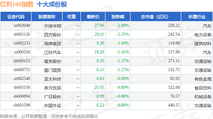 证券之星消息,12月18日,红利100(399411)指数报收于3449.45点,涨0.78%,成交369.8亿元,换手率0.25%。当日该指数成份股中,上涨的有69家,陕西煤业以3.74%的涨幅领涨,下跌的有28家,宁波华翔以2.8%的跌幅领跌。