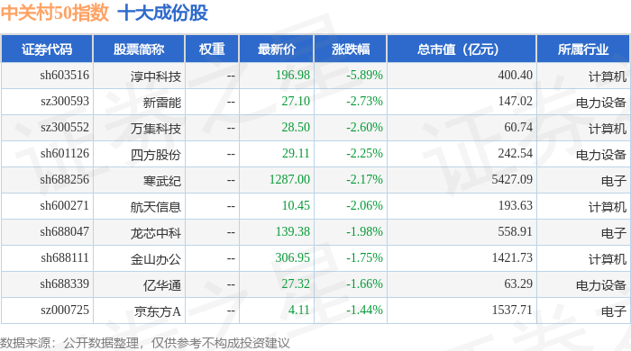中关村50(399423)指数十大成份股详情如下: