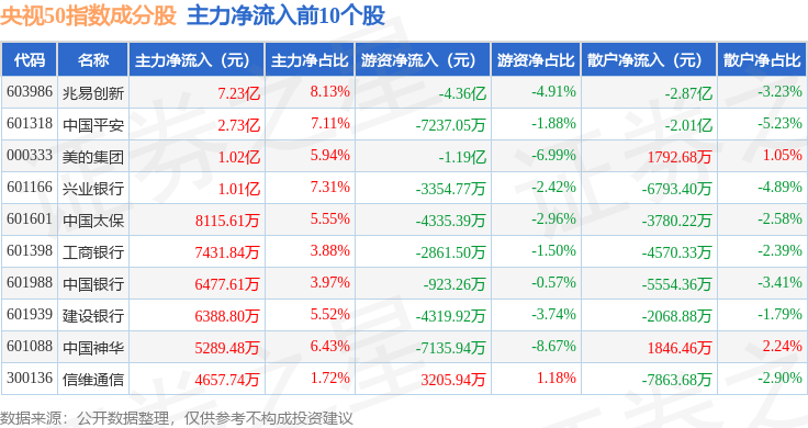 资金流向方面,央视50(399550)指数成份股当日主力资金净流入合计6.76亿元,游资资金净流出合计7.03亿元,散户资金净流入合计2639.15万元。成份股资金流向详情见下表: