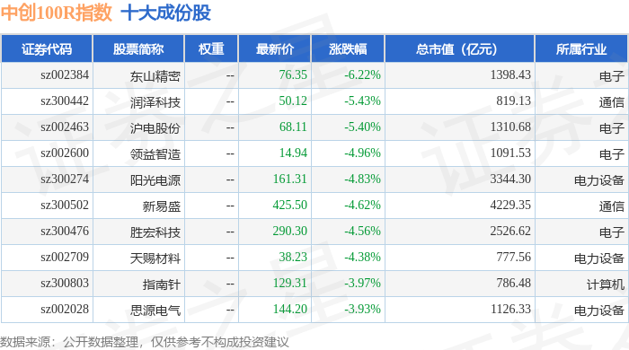 证券之星消息,12月18日,中创100R(399611)指数报收于3164.63点,跌1.88%,成交1774.12亿元,换手率1.12%。当日该指数成份股中,上涨的有26家,新诺威以7.23%的涨幅领涨,下跌的有72家,东山精密以6.22%的跌幅领跌。