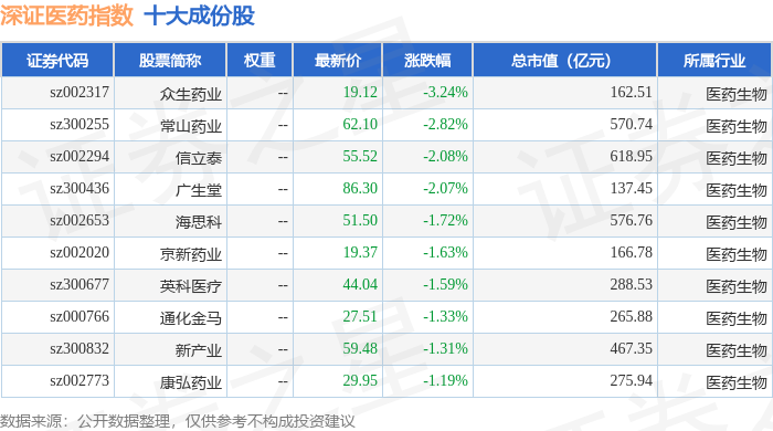 证券之星消息,12月18日,深证医药(399618)指数报收于8086.63点,涨0.14%,成交187.23亿元,换手率1.62%。当日该指数成份股中,上涨的有35家,美年健康以10.05%的涨幅领涨,下跌的有27家,众生药业以3.24%的跌幅领跌。