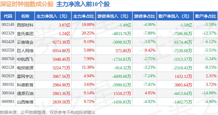 资金流向方面,深证时钟(399644)指数成份股当日主力资金净流出合计11.55亿元,游资资金净流出合计1.3亿元,散户资金净流入合计12.86亿元。成份股资金流向详情见下表: