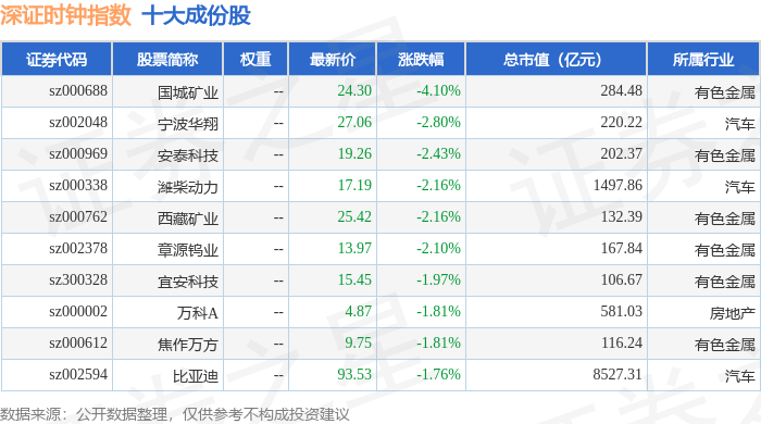 证券之星消息,12月18日,深证时钟(399644)指数报收于3446.03点,跌0.6%,成交445.02亿元,换手率1.41%。当日该指数成份股中,上涨的有53家,西部材料以10.01%的涨幅领涨,下跌的有43家,国城矿业以4.1%的跌幅领跌。