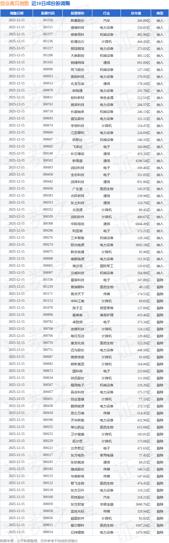 近10日内创业高贝(399694)指数成份股做了调整,新纳入了37只股票,剔除了37只股票。