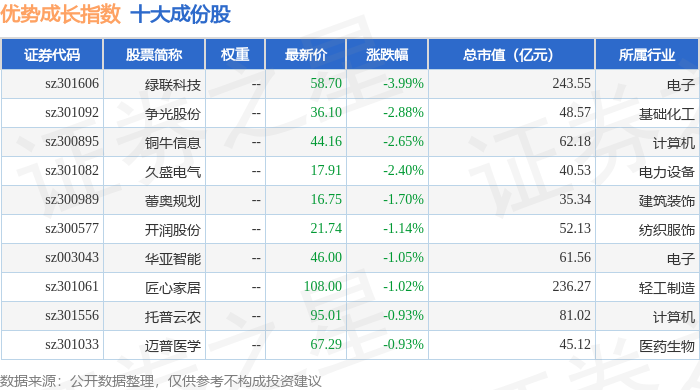 证券之星消息,12月18日,优势成长(399698)指数报收于51738.03点,涨0.49%,成交59.76亿元,换手率1.94%。当日该指数成份股中,上涨的有30家,奥佳华以10.0%的涨幅领涨,下跌的有19家,绿联科技以3.99%的跌幅领跌。