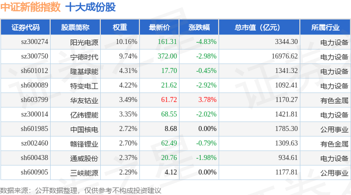 中证新能(399808)指数十大成份股详情如下: