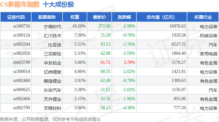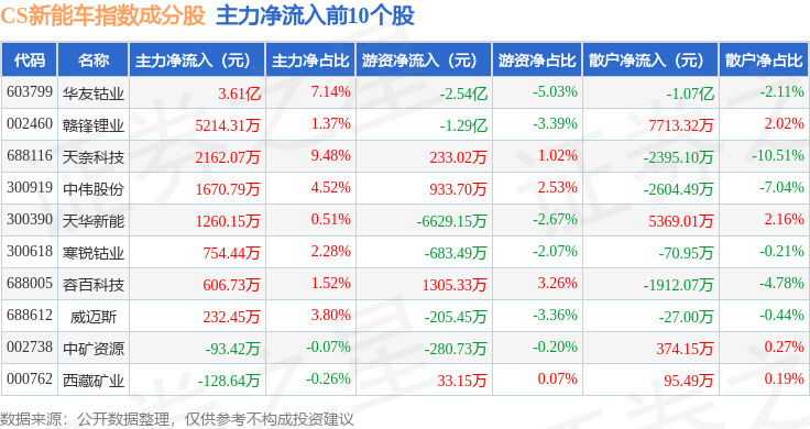 资金流向方面,CS新能车(399976)指数成份股当日主力资金净流出合计43.03亿元,游资资金净流入合计7.2亿元,散户资金净流入合计35.38亿元。成份股资金流向详情见下表: