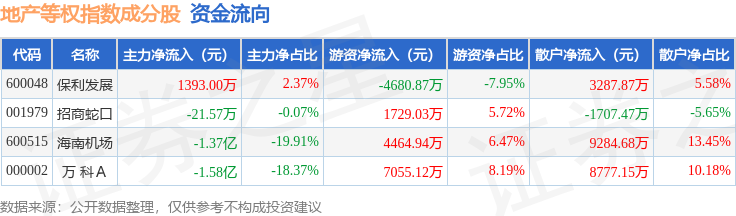 资金流向方面,地产等权(399983)指数成份股当日主力资金净流出合计2.82亿元,游资资金净流入合计8568.24万元,散户资金净流入合计1.96亿元。成份股资金流向详情见下表: