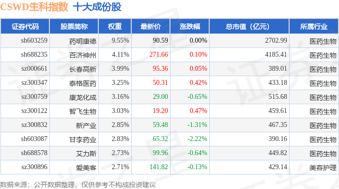 证券之星消息,12月18日,CSWD生科(399993)指数报收于2619.22点,跌0.04%,成交133.18亿元,换手率0.99%。当日该指数成份股中,上涨的有60家,仁度生物以6.84%的涨幅领涨,下跌的有37家,阳光诺和以4.1%的跌幅领跌。
