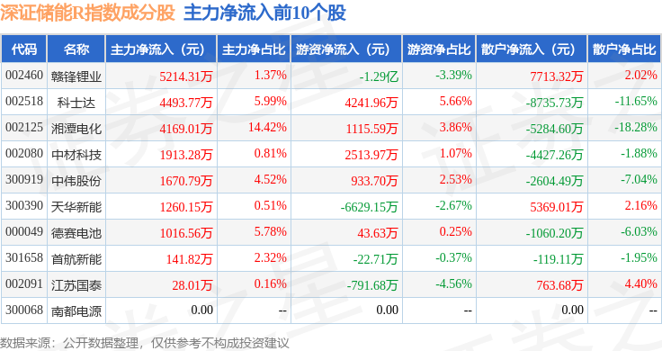 资金流向方面,深证储能R(470036)指数成份股当日主力资金净流出合计54.74亿元,游资资金净流入合计9.02亿元,散户资金净流入合计45.71亿元。成份股资金流向详情见下表: