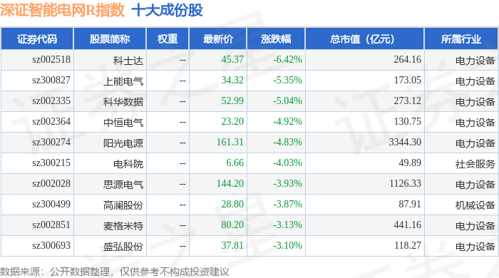 证券之星消息,12月18日,深证智能电网R(470054)指数报收于4106.35点,跌2.46%,成交246.08亿元,换手率2.45%。当日该指数成份股中,上涨的有9家,恒华科技以1.77%的涨幅领涨,下跌的有40家,科士达以6.42%的跌幅领跌。