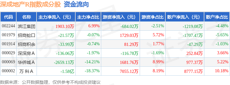 资金流向方面,深成地产R(471001)指数成份股当日主力资金净流出合计1.68亿元,游资资金净流入合计9746.4万元,散户资金净流入合计7033.51万元。成份股资金流向详情见下表: