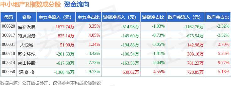 资金流向方面,中小地产R(471002)指数成份股当日主力资金净流入合计367.01万元,游资资金净流出合计489.93万元,散户资金净流入合计122.92万元。成份股资金流向详情见下表: