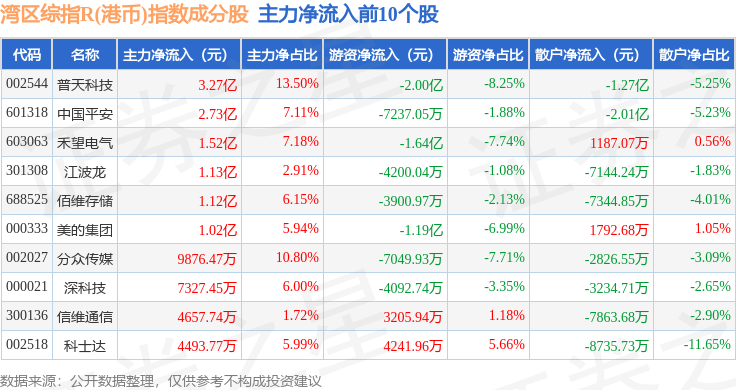 资金流向方面,湾区综指R(港币)(480004)指数成份股当日主力资金净流出合计94.3亿元,游资资金净流入合计26.35亿元,散户资金净流入合计67.52亿元。成份股资金流向详情见下表: