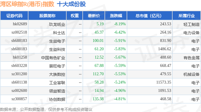湾区综指R(港币)(480004)指数十大成份股详情如下: