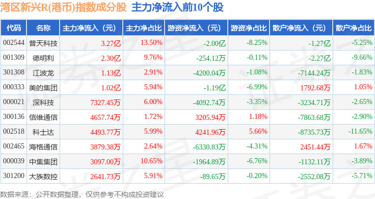 资金流向方面,湾区新兴R(港币)(480008)指数成份股当日主力资金净流出合计53.23亿元,游资资金净流入合计14.24亿元,散户资金净流入合计38.99亿元。成份股资金流向详情见下表: