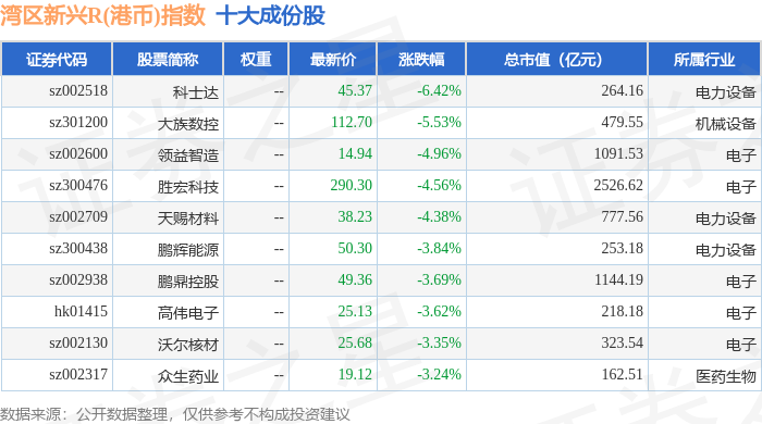 湾区新兴R(港币)(480008)指数十大成份股详情如下: