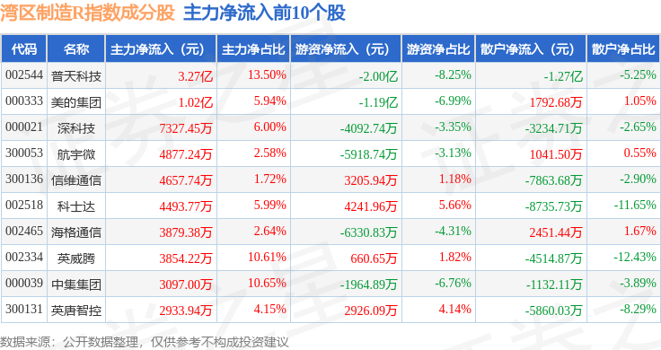 资金流向方面,湾区制造R(480009)指数成份股当日主力资金净流出合计49.71亿元,游资资金净流入合计16.5亿元,散户资金净流入合计33.21亿元。成份股资金流向详情见下表: