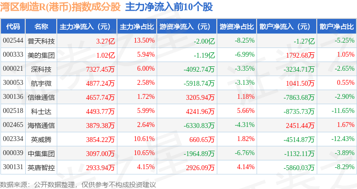 资金流向方面,湾区制造R(港币)(480010)指数成份股当日主力资金净流出合计49.71亿元,游资资金净流入合计16.5亿元,散户资金净流入合计33.21亿元。成份股资金流向详情见下表: