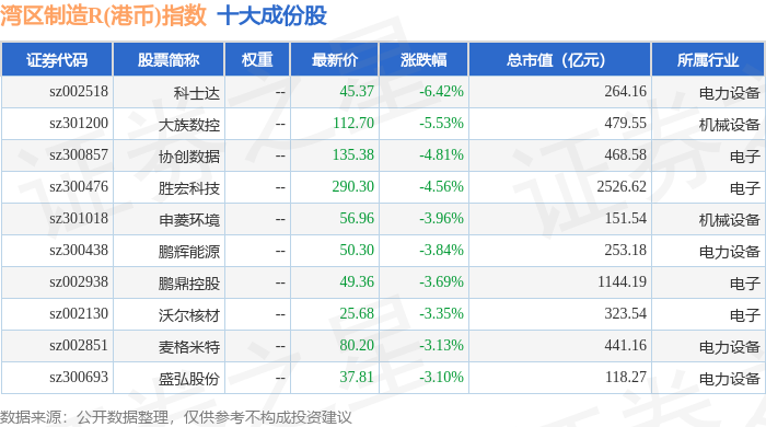 湾区制造R(港币)(480010)指数十大成份股详情如下: