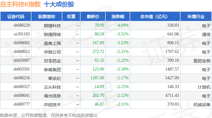 自主科技R(480033)指数十大成份股详情如下:
