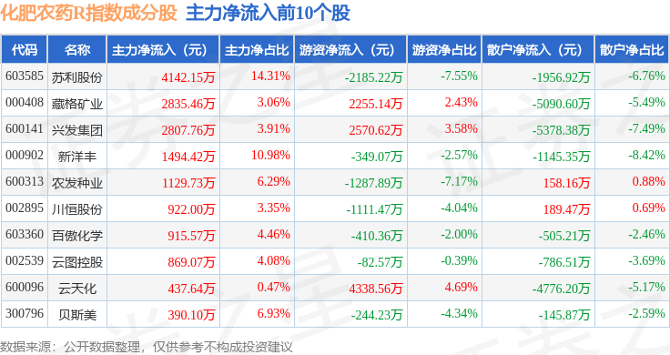 资金流向方面,化肥农药R(480035)指数成份股当日主力资金净流出合计3.7亿元,游资资金净流入合计1.22亿元,散户资金净流入合计2.53亿元。成份股资金流向详情见下表: