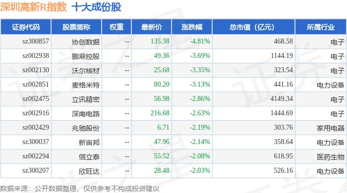 深圳高新R(480038)指数十大成份股详情如下: