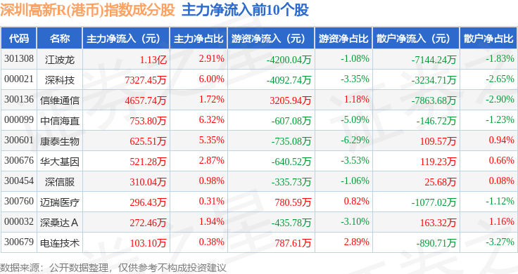 资金流向方面,深圳高新R(港币)(480039)指数成份股当日主力资金净流出合计36.13亿元,游资资金净流入合计10.97亿元,散户资金净流入合计25.16亿元。成份股资金流向详情见下表:
