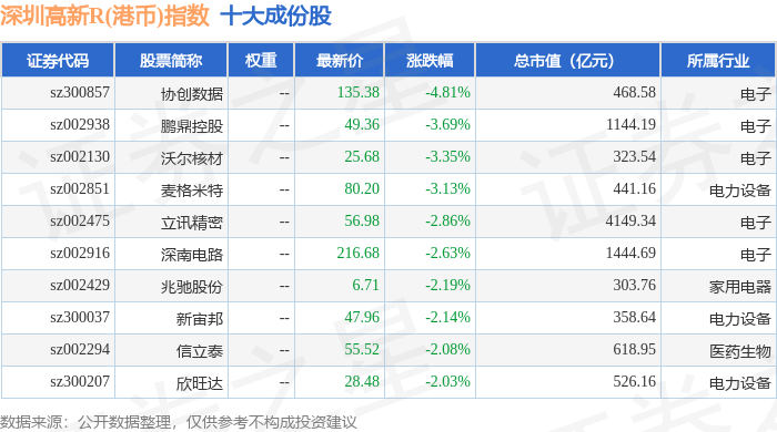 深圳高新R(港币)(480039)指数十大成份股详情如下: