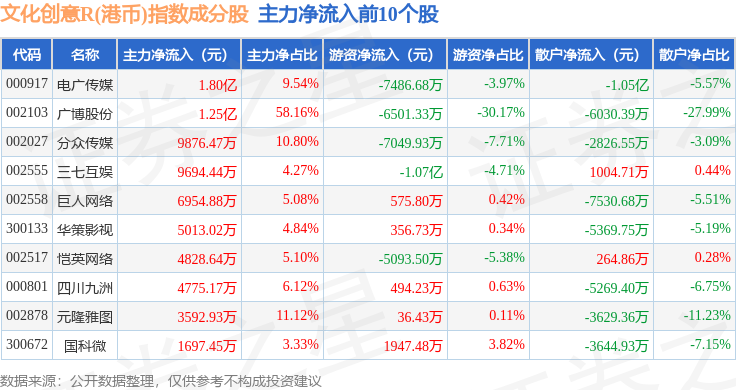 资金流向方面,文化创意R(港币)(480047)指数成份股当日主力资金净流出合计9.29亿元,游资资金净流出合计4054.59万元,散户资金净流入合计9.7亿元。成份股资金流向详情见下表: