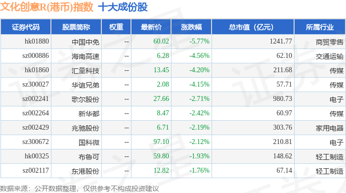 文化创意R(港币)(480047)指数十大成份股详情如下: