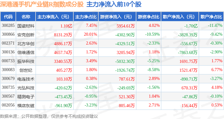 资金流向方面,深港通手机产业链R(483009)指数成份股当日主力资金净流出合计50.94亿元,游资资金净流入合计15.42亿元,散户资金净流入合计35.52亿元。成份股资金流向详情见下表: