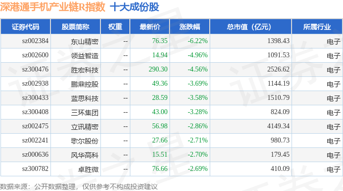 深港通手机产业链R(483009)指数十大成份股详情如下: