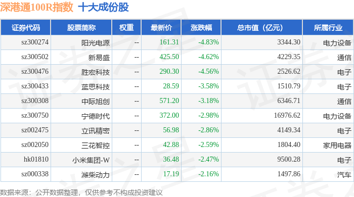 证券之星消息,12月18日,深港通100R(483007)指数报收于9066.99点,跌1.09%,成交1510.4亿元,换手率0.35%。当日该指数成份股中,上涨的有37家,中国石油化工股份以3.37%的涨幅领涨,下跌的有61家,阳光电源以4.83%的跌幅领跌。