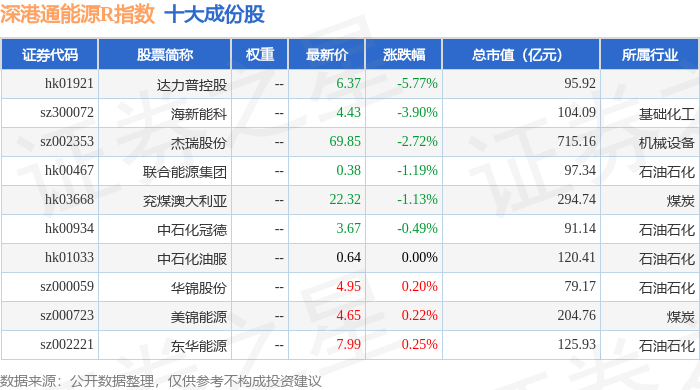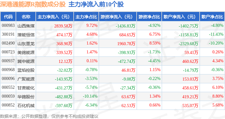 资金流向方面,深港通能源R(483013)指数成份股当日主力资金净流出合计6955.79万元,游资资金净流出合计2561.15万元,散户资金净流入合计9516.94万元。成份股资金流向详情见下表: